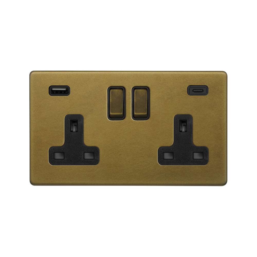 Soho Lighting Old Brass 2 Gang USB A+C Socket (13A Socket + 2 USB Ports A+C 3.1A)