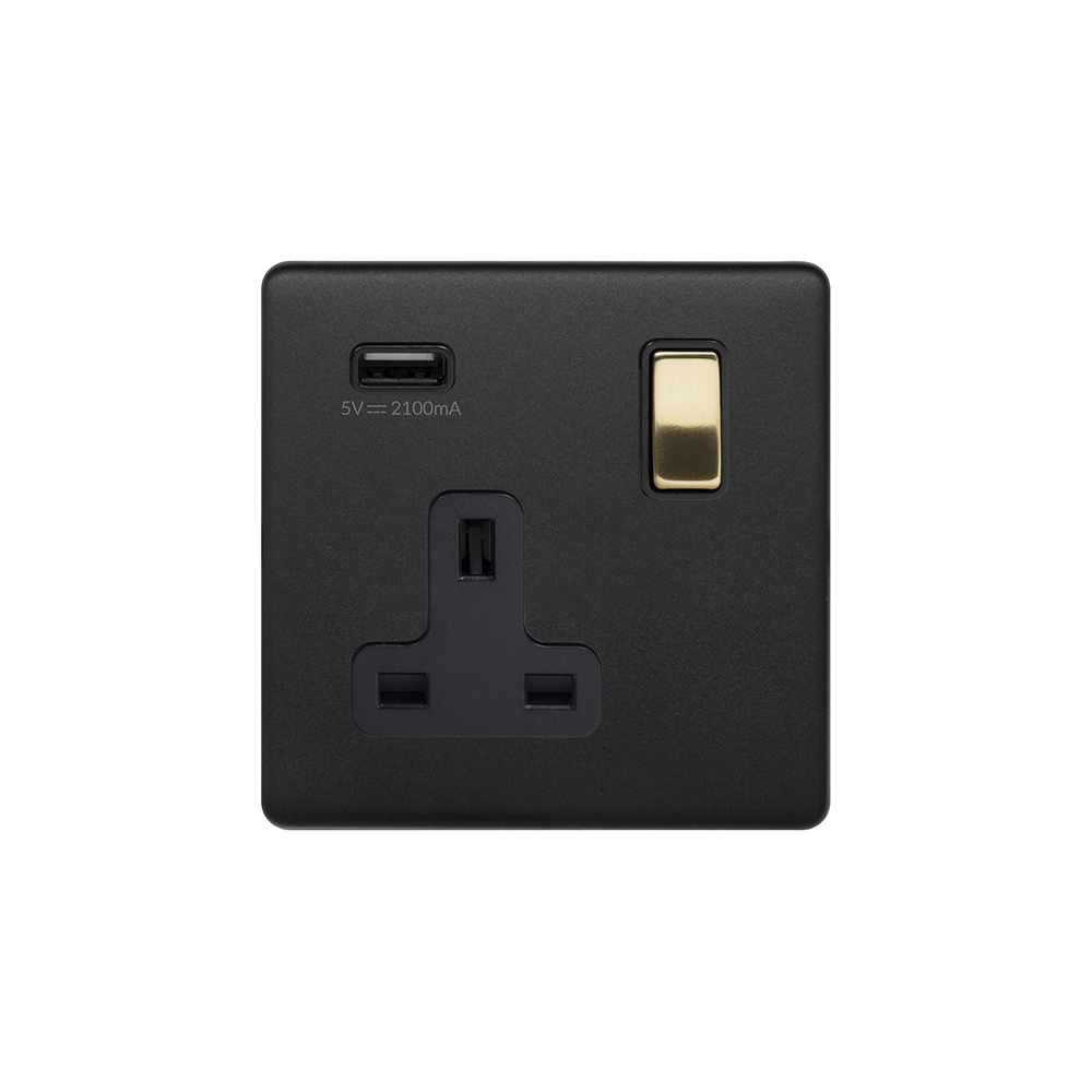 Soho Fusion Matt Black & Brushed Brass 1 Gang 13A DP Socket with USB-A 2.1A - The Soho Lighting Company