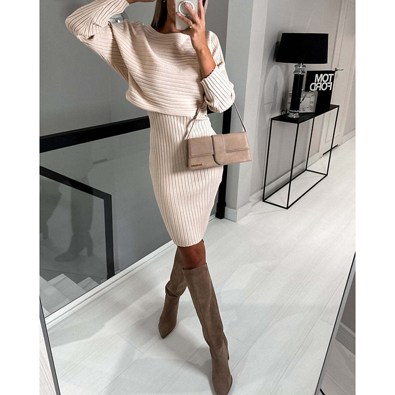 Women's Dress Set Slip Dress Elegant Casual Plain Design Midi Dress Long Sleeve Crew Neck Outdoor Vacation Dark Brown Black Beige Spring Fall Regular Fit