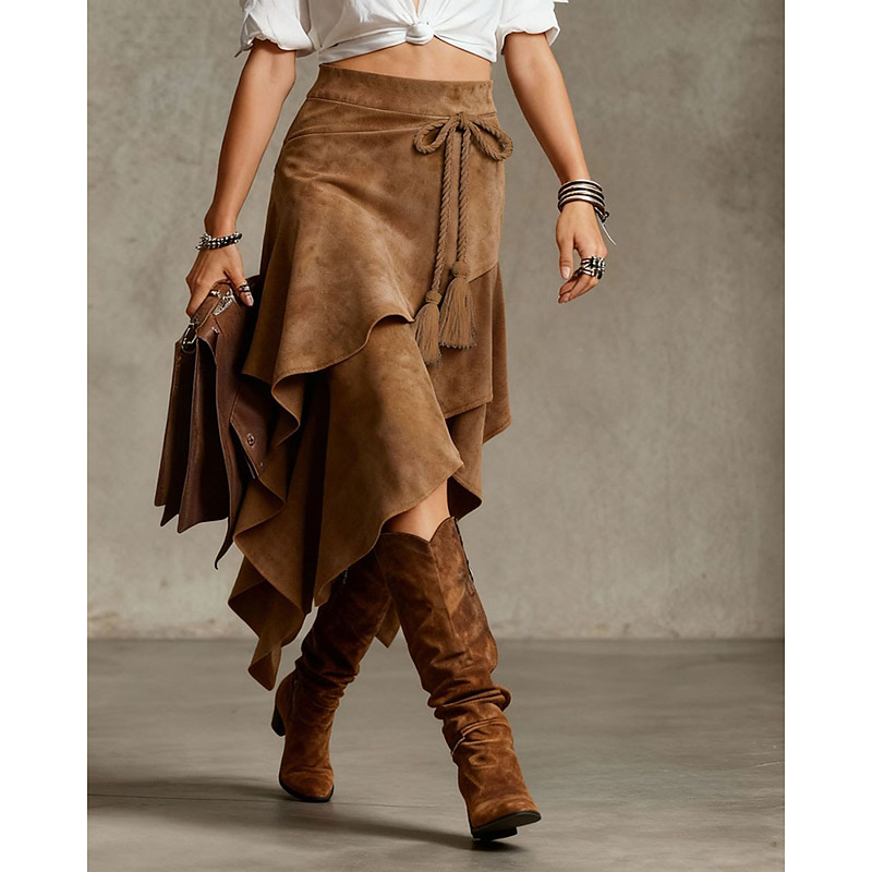 Women's Skirt Vintage Fashion Casual Midi High Waist Skirts Plain Drawstring Irregular Hem Micro-elastic Daily Street Brown Khaki Spring Polyester