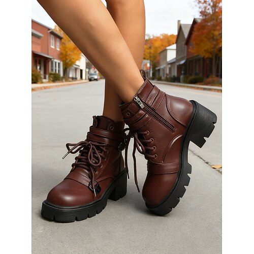 stivali da combattimento con tacco grosso marrone scuro da donna: stivaletti alla caviglia con lacci e cinturini con fibbia, calzature autunnali alla moda per streetwear e outfit quotidiani
