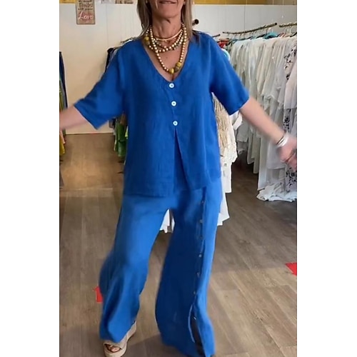 Per donna Set di biancheria in cotone Set di Pantaloni Manica Corta Colletto a Camicia Tinta unica Elegante Moda Streetwear Casuale Quotidiano All'aperto Blu Nero Bianco Estate Vestibilità regolare
