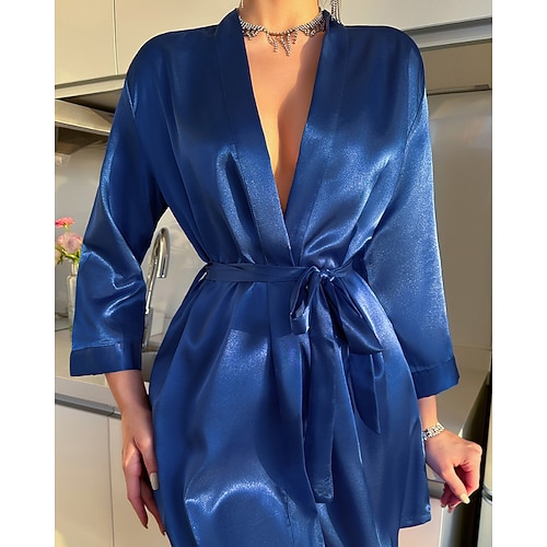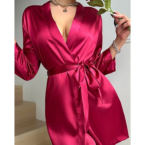 Damen Robe Lässig Weich Satin Einfarbig Schnürung Täglich Heim Bett Langarm V Ausschnitt Schwarz Weiß Champagner Rosa Wein Sommer Frühling Normale Passform Lässiger Schnitt
