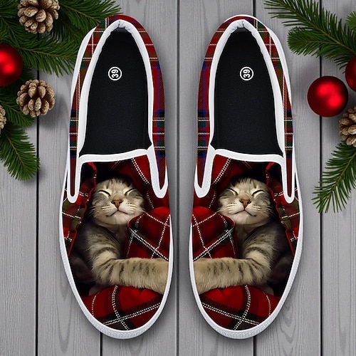 scarpe da donna rosse slip-on natalizie con gatto che indossa un cappello da Babbo Natale: stile natalizio divertente, calzature casual comode e calde per feste di Natale e regali