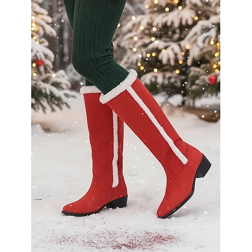 stivali alti fino al ginocchio in finta pelle scamosciata rossa da donna: eleganti stivali invernali foderati in sherpa per outfit natalizi, passeggiate con tempo freddo e riunioni di festa