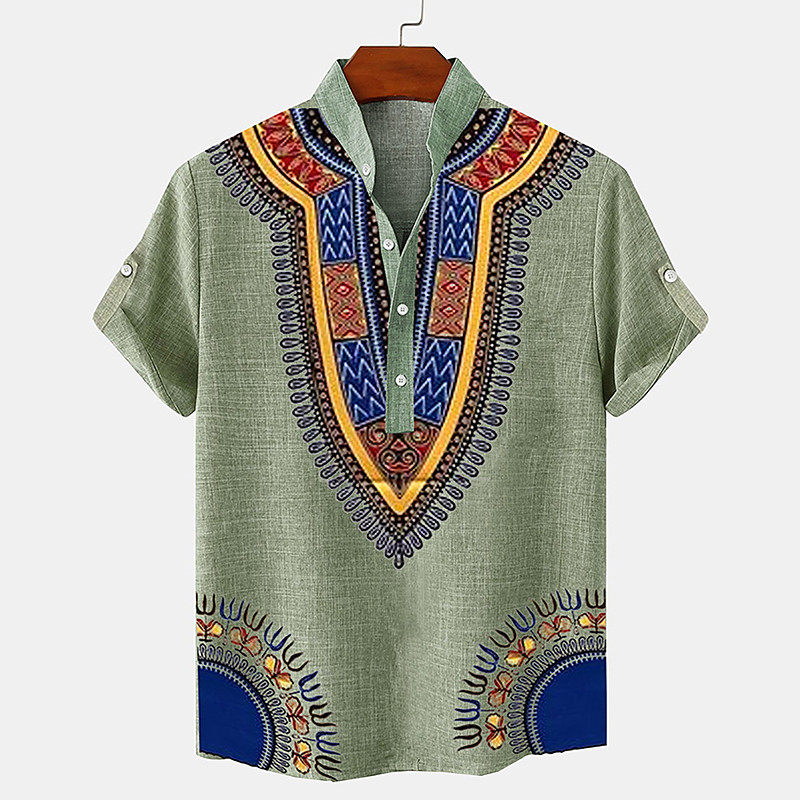 Men's Linen Shirt Henley Shirt Retro Shirts Vintage Shirt Ethnic Shirt Vacation Daily Green Khaki Beige Short Sleeve Mandarin Collar Summer Spring Clothing Apparel 3D Print