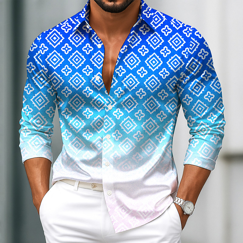 Men's Geometric Gradient Color Shirt Satin Shirt Dress Shirt Long Sleeve Vintage Retro Vacation Dailywear Summer Spring Fall Turndown 3D Print Button Up Shirts Blue Green