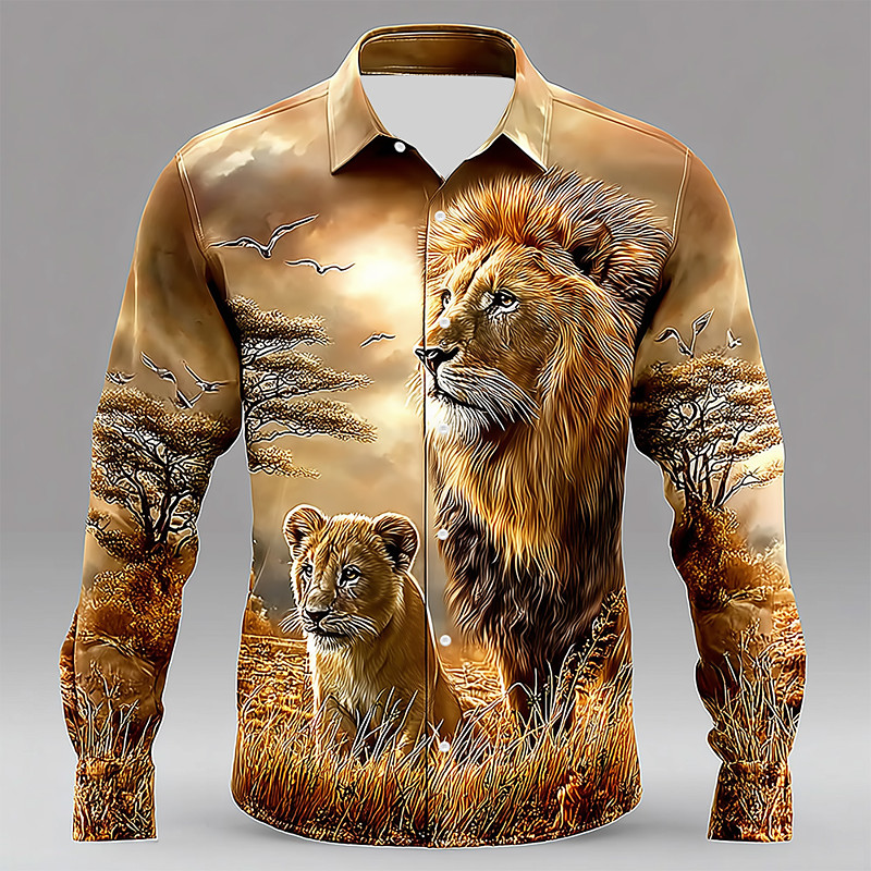 Men's Animal Lion Nature Shirt Button Up Shirt Long Sleeve Vintage Retro Outdoor Casual Holiday Spring Fall Turndown 3D Print Collared Shirts Dark Khaki Brown Green Khaki