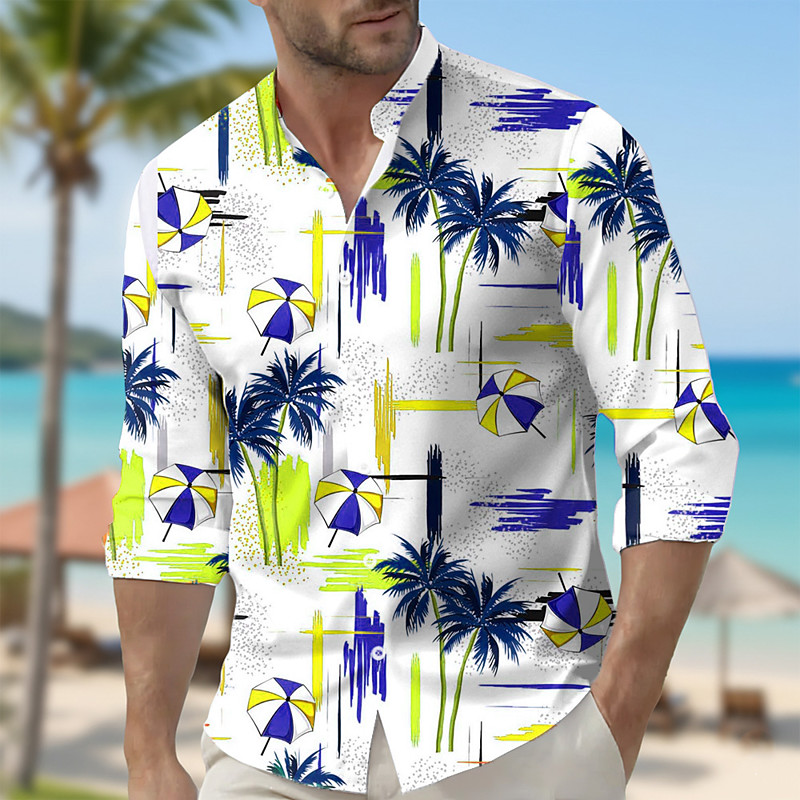 Men's Geometric Coconut Tree Tropical Plants Shirt Hawaiian Shirt Stand Collar Shirt Long Sleeve Hawaiian Outdoor Vacation Spring Fall Mandarin Collar Band Collar 3D Print Button Up Shirts Blue Purple