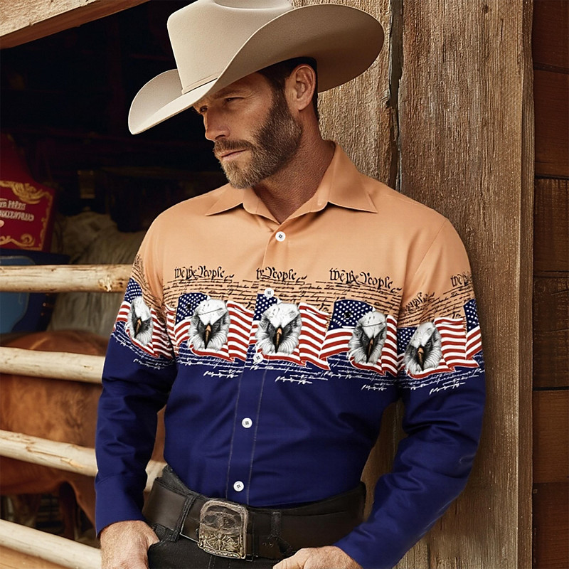 Men's Eagle US Flag America's 250th Anniversary Shirt Western Shirt Cowboy Shirt Long Sleeve Vintage Retro Vacation Holiday Spring Fall Turndown 3D Print Linen Like Shirt Yellow Purple Orange