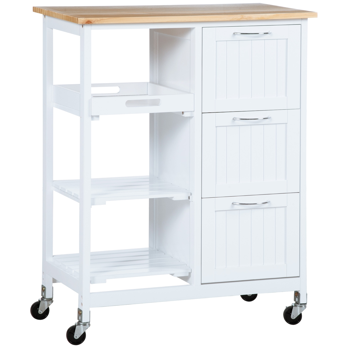 OKWISH Küchenwagen Servierwagen auf Rollen 87x67x37 cm mit 3 Schubladen, Arbeitsplatte und offenen Regalen, Weiß aus MDF mit Kiefernholzplatte