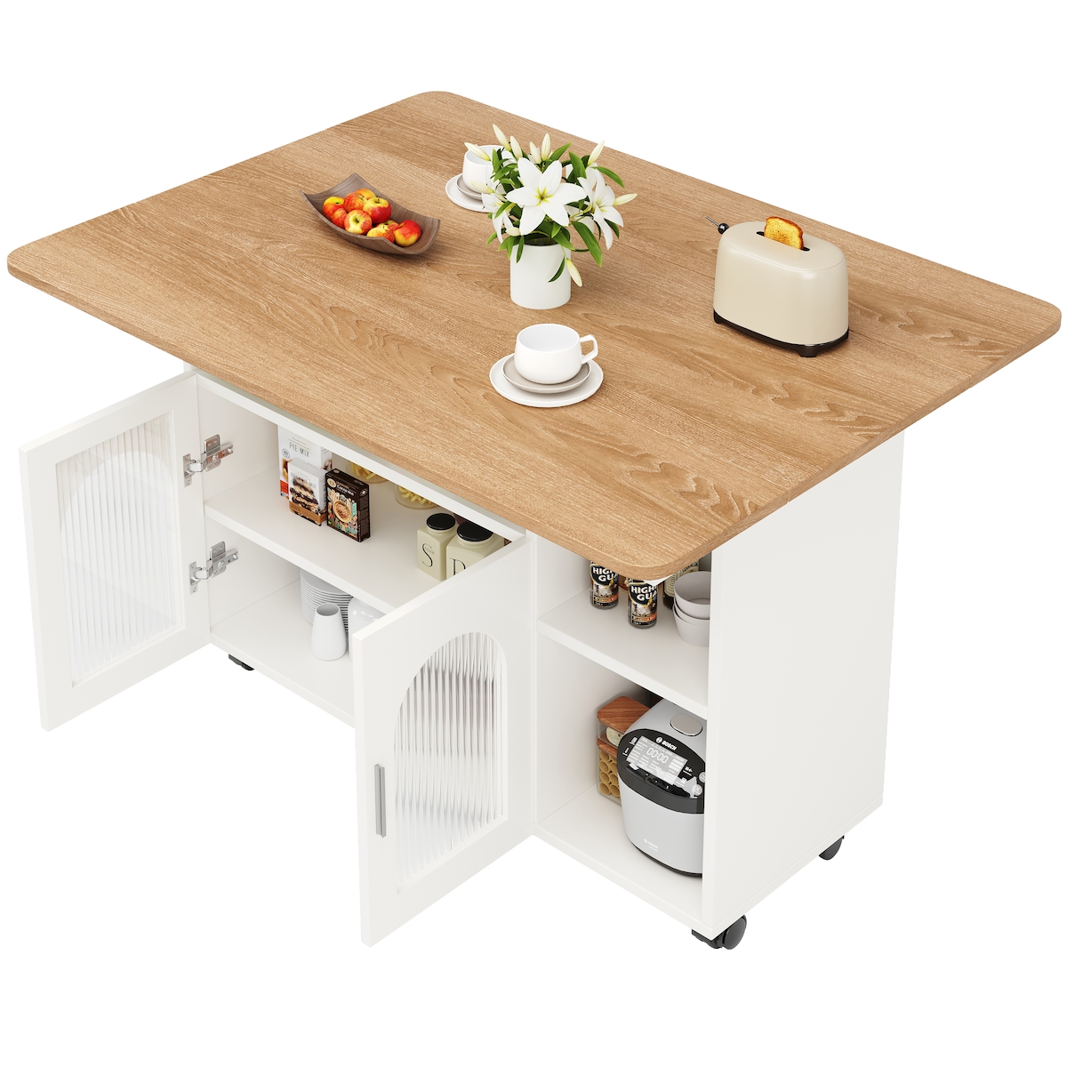 MODFU Kücheninsel Küchenwagen 120x70x80 cm Weiß mit klappbarer Tischplatte, Rollen und Stauraum, MDF Glas Metall, moderne Holzoptik