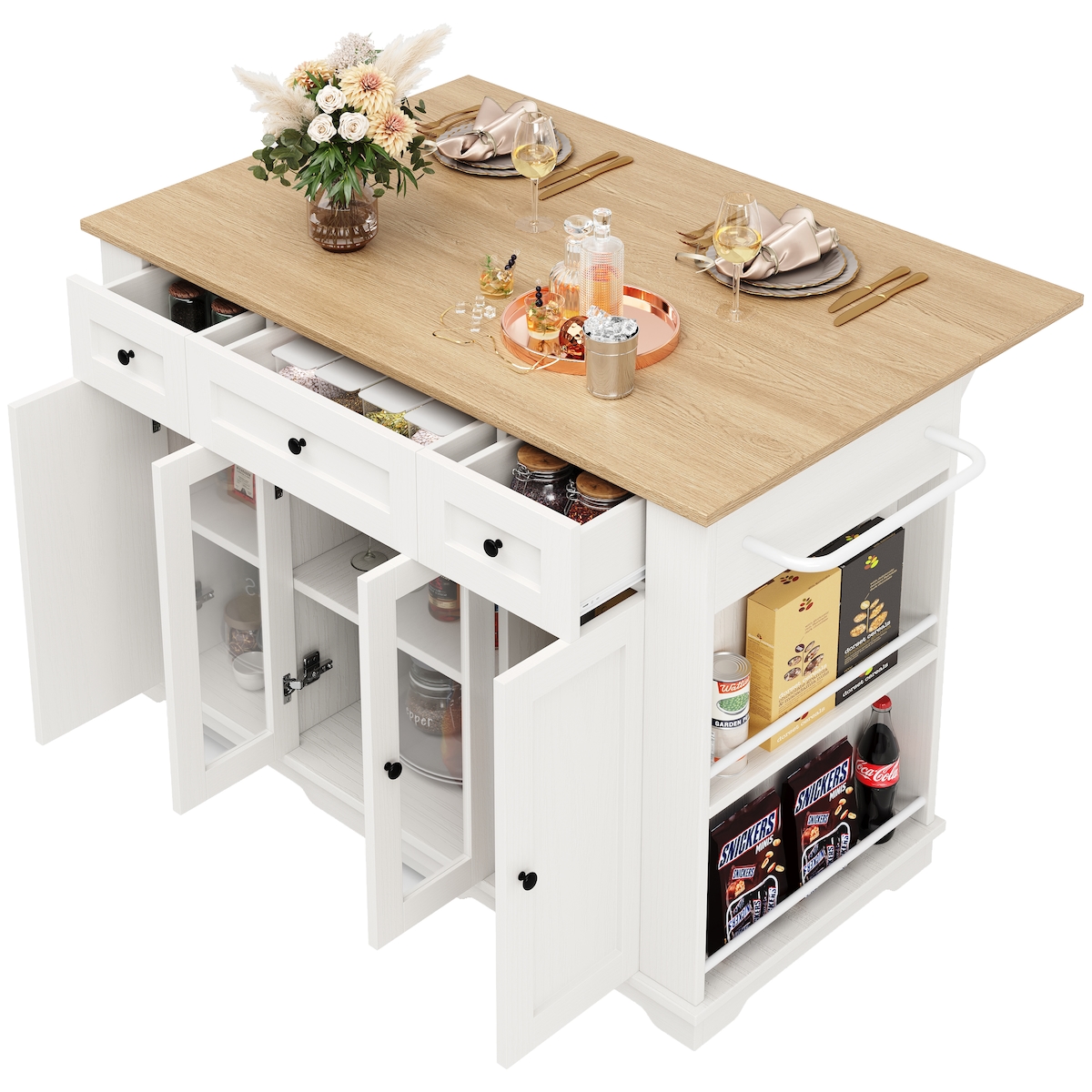 STILVORA Kücheninsel Küchenwagen 91x151x60 cm klappbare Tischplatte mit Schublade Stauraum Ablagen Türen mit Hartglas Weiß+Natur