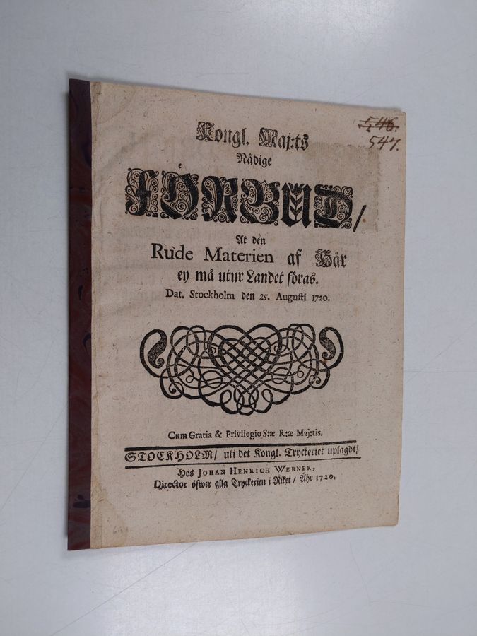Sverige Kungl. Maj:t : Kongl. Maj:ts nådige Förbud, At den Rude Materien af Hår ey må utur Landet föras. Dat. Stockholm den 25. augusti 1720