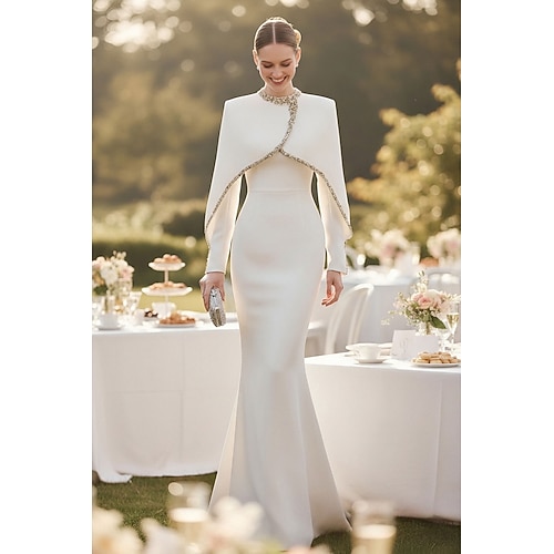 Abito formale A-Line lunghezza al pavimento abito da sera abito da sera elegante vintage maniche lunghe collo alto matrimonio formale con cristalli e perline