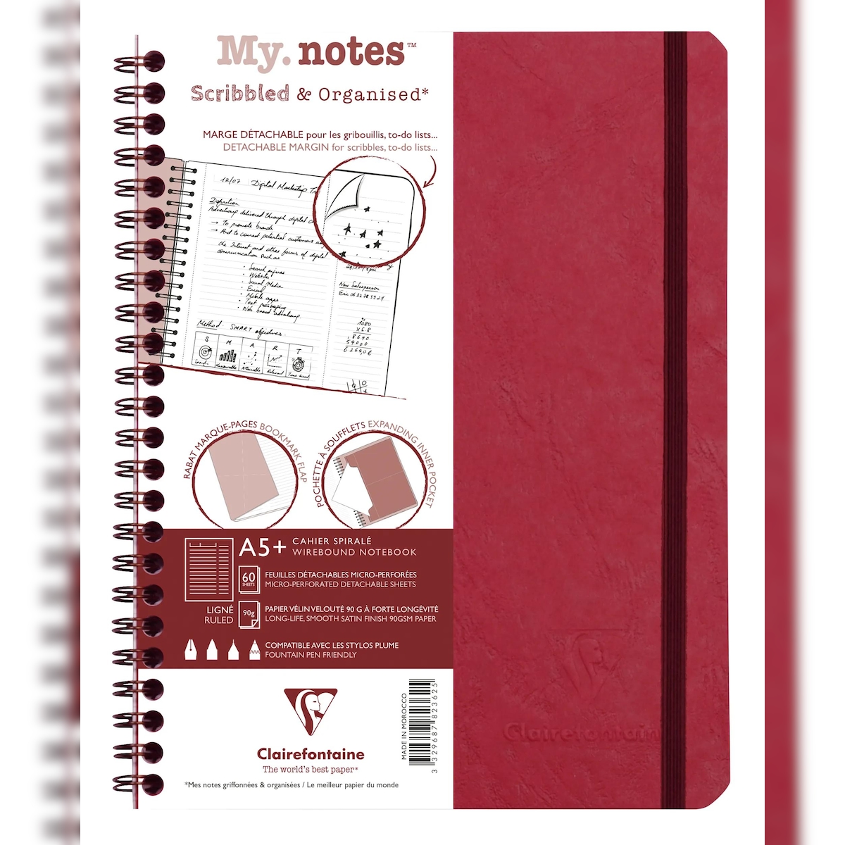 Clairefontaine 5x My.Notes Age Bag, Spiralheft A5+, 60 Blatt 90g, liniert mit Kopfleiste, abtrennbar, mikroperforiert - Rot 782362C