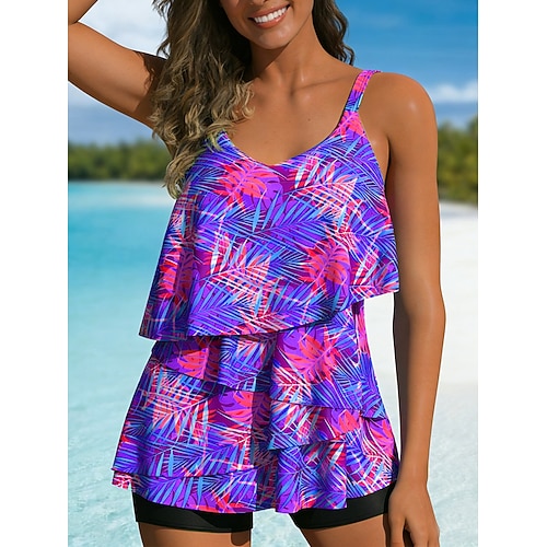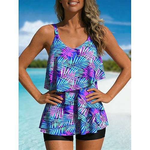 Per donna Costumi da bagno Tankini Due pezzi Vita alta Costume da bagno Controllo della Pancia Vita alta Snello Senza schiena Vacanza Abbigliamento da Spiaggia Tropicale Collo a U Senza Maniche