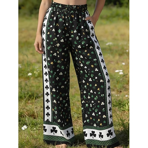 Pantaloni Donna St. Patrick a Gamba Larga Pantaloni Palazzo Vacanza Vintage Base Lunghezza Completa Vita Alta Pantaloni Shamrock Ricamati Tasca Vita Elastico Comfort Traspirabilità Comodo Non Elastico