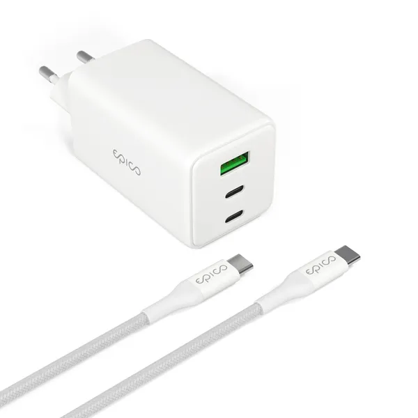Epico UltraBoost GaN 100W Wall Charger EA100 with 1.2m USB-C to USB-C Cable | White | 2 × USB-C PD & 1 × USB-A