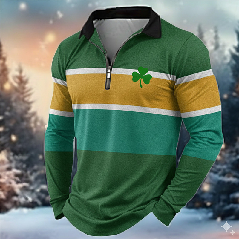 St. Patrick Men's Stripe Shamrock Polo Long Sleeve Turndown Modern Leisure Athleisure Casual Daily Festival Zipper 3D Print Spring Fall Black Green Gray