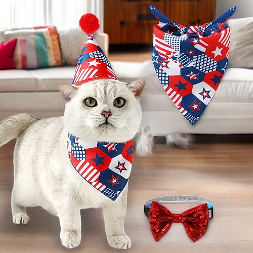 3-teiliges Haustier-Outfit zum 4. Juli inklusive Hut, Paillettenfliege und Schal, verstellbarem Stirnband für Kätzchen, Welpen, kleine Hunde und Katzen sowie Pflegeaccessoires für den