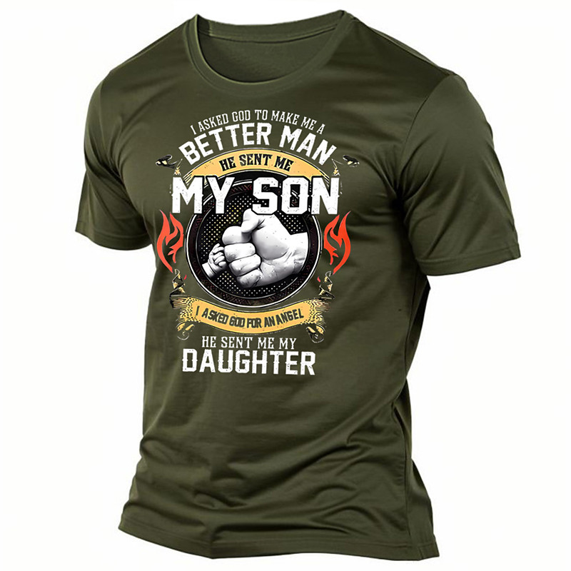 Mens Dad Graphic T-Shirt: 'Better Man My Son, Angel My Daughter' Family Quote, Short Sleeve Red