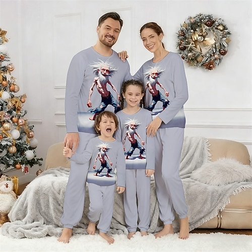 Familie Weihnachten Weihnachtspyjama für die Familie Schlafanzug Familiensets Grafik Cartoon Heim Druck Grau Langarm Täglich Passende Outfits