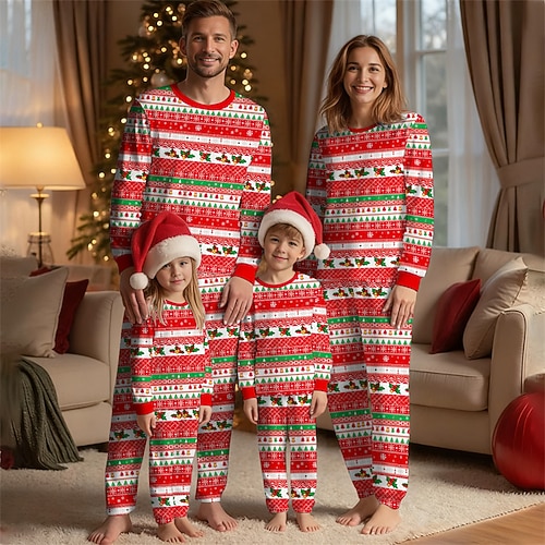 Familie Weihnachten Weihnachtspyjama für die Familie Schlafanzug Familiensets Grafik Weihnachtsbaum Weihnachtsglocke Heim Druck Rote Langarm Täglich Passende Outfits