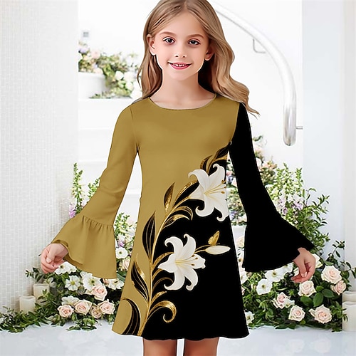 ragazze' 3D Grafico Fiore Abito Manica Lunga Estate Primavera Vacanza Quotidiano Ferie Principessa Bello Dolce Bambini 4-12 Anni Vestito Casual Abito a trapezio Lunghezza al ginocchio Vestibilit