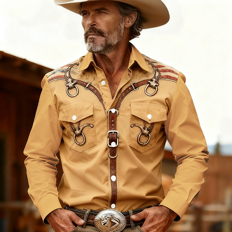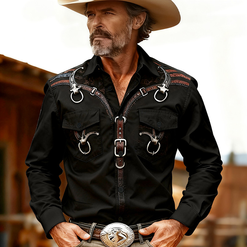 Men's Harness Tack Hardware Shirt Western Shirt Cowboy Shirt Long Sleeve Vintage Retro Outdoor Casual WorkWear Spring Fall Turndown Front Two Pockets Linen Like Shirt Button Up Shirts Blue Black