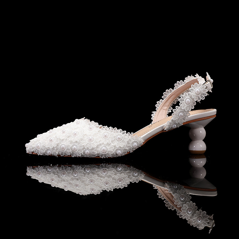 Women's Elegant White Lace Slingback Heels with Pearl and Floral Embellishments – Chic Block Heels for Weddings and Special Occasions