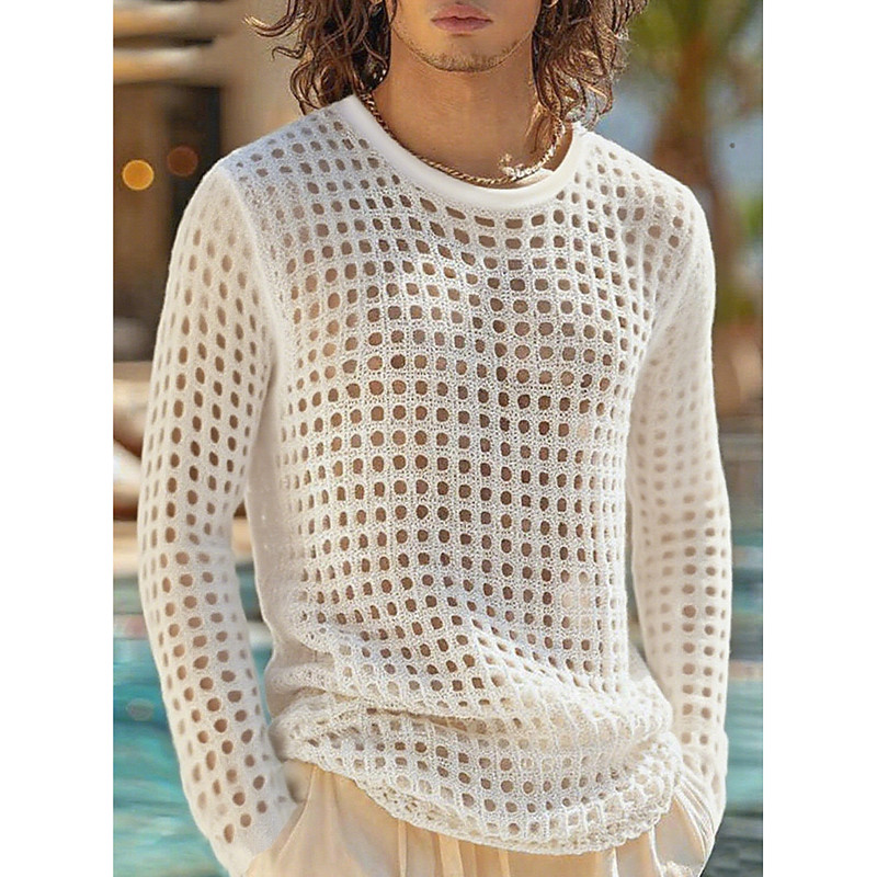 Men's Tee Top Long Sleeve Shirt Long Sleeve Crew Neck Summer Spring Solid Color Mesh Daily Casual Street Style Hollow Out Outdoor Street Causal White Black Top Tee for Men