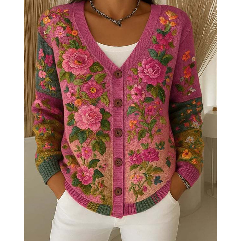 Women's Sweater Cardigan Streetwear Casual Floral Ribbed V Neck Knitted Print Long Sleeve Regular Tops Knit Daily Holiday Going out Hot Pink White Fall Winter