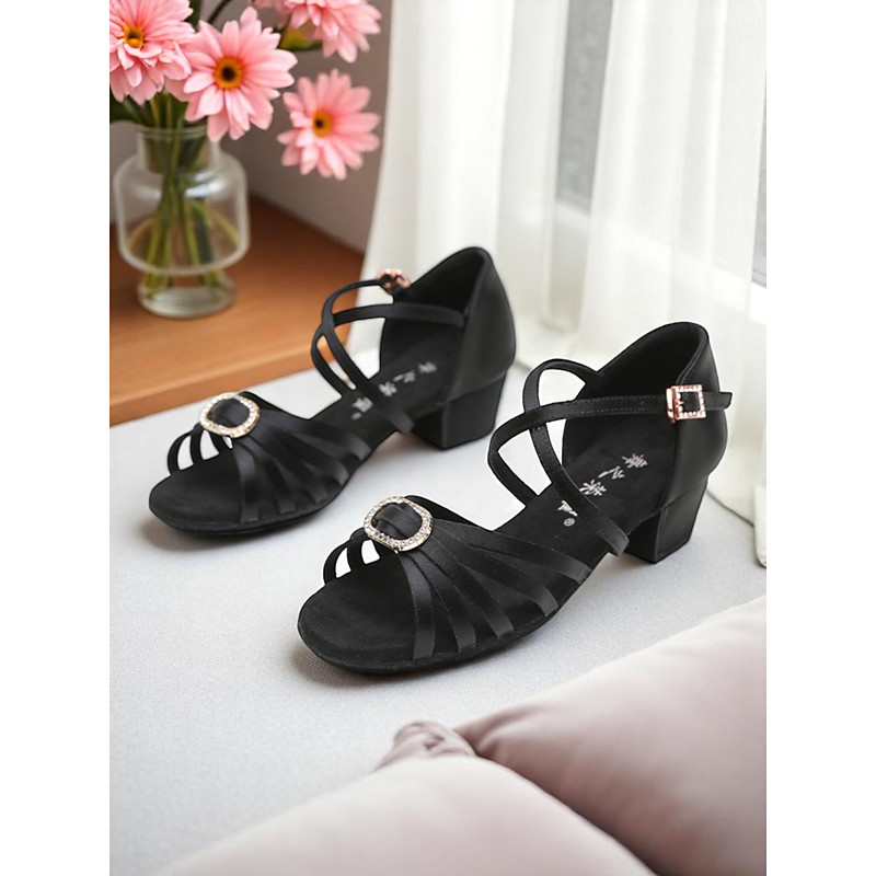Girls' Satin Low Heel Ballroom Dance Shoes with Rhinestone Buckle – Comfortable Latin Practice Sandals for Kids and Beginners