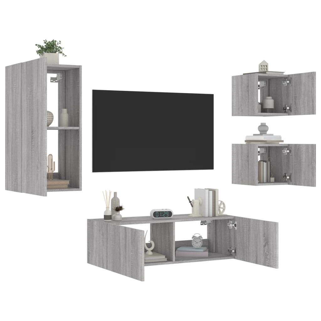 Tv-møbel til væg LED-lys 4 dele grå sonoma-eg
