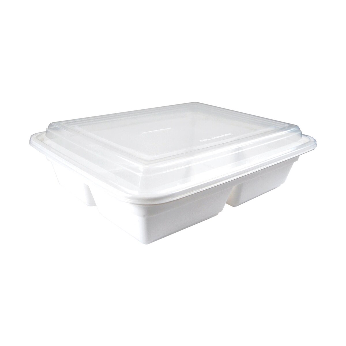 50x Menüboxen aus PP wiederverwendbar mit Deckel 3-geteilt weiß 23x18x6.5cm