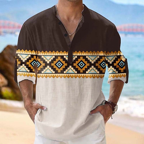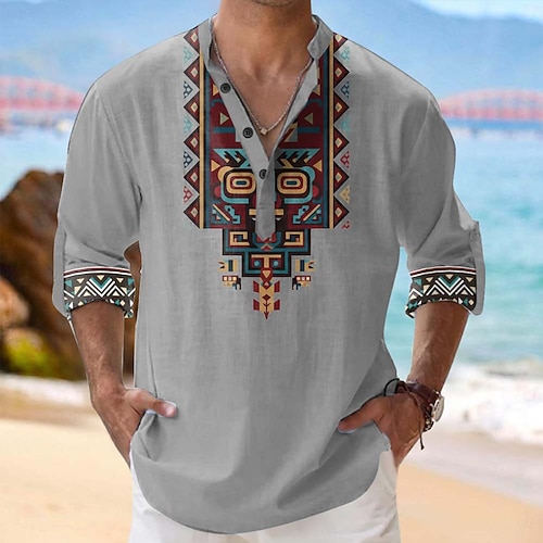 Per uomo Geometrico Azteco Tribale Camicia Camicia con Bottoni Maglia Henley Manica Lunga Vintage Retrò Casuale Vacanza Estate Primavera Collo alla coreana Colletto Mao Stampa 3D Camicia tipo lino