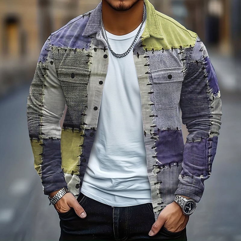 Men's Color Block Patchwork Denim-like Corduroy Shirt Shirt Jacket Overshirt Long Sleeve Vintage Retro Outdoor Dailywear Fall Winter Turndown Button-Down Warm Jacket with Flap Pockets Blue Purple