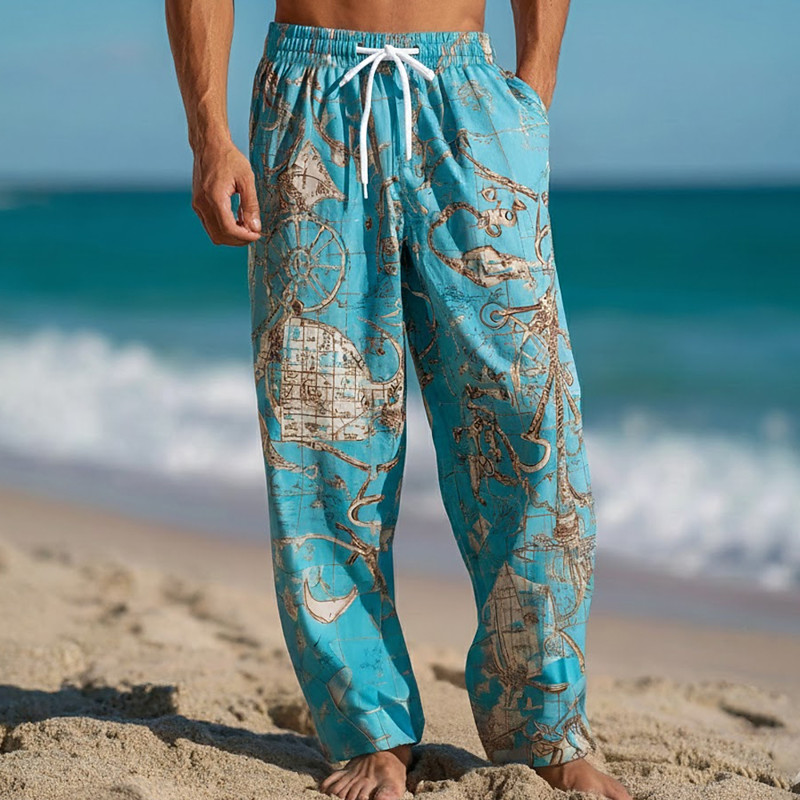 Men's Nautical Compass Sailboat Trousers Baggy Pants Casual Pants Mid Waist Vintage Retro Outdoor Vacation Beach Wear Elastic Drawstring Waist Linen-Like Pants with Pockets Summer Spring 3D Print