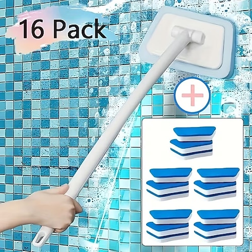 Das 16-teilige multifunktionale Reinigungsbürstenset beinhaltet eine Duschbürste, eine Badewannenbürste, eine Fliesenbürste, eine Fensterbürste und eine Bodenbürste mit austauschbaren, abnehmbaren