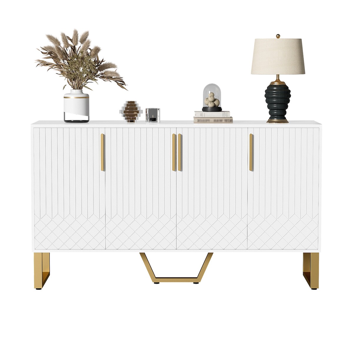 OKWISH Sideboard 140x40x80cm Hochglanz Weiß Modern mit Metallbeinen und Griffen, Geometrisches Muster, Vier Türen, Wohnzimmer, Esszimmer