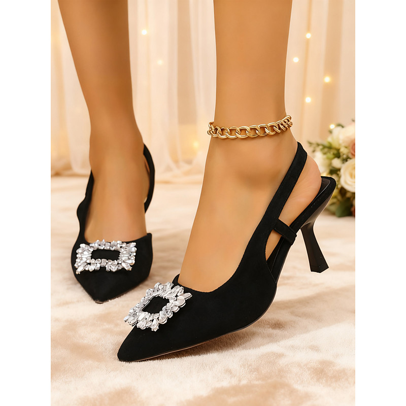 Women's Blue Satin Slingback Heels - Pointed Toe Pumps with Crystal Rhinestone Buckle for Cocktail Party, Evening Events or Formal Occasions