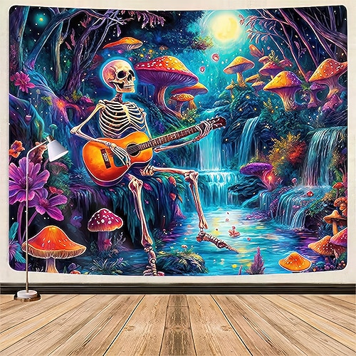 Arazzo estetico con scheletro chitarrista, bagliore psichedelico, fungo, foresta, arte murale, cascata psichedelica, chiaro di luna, sfondo per sala musica, studio