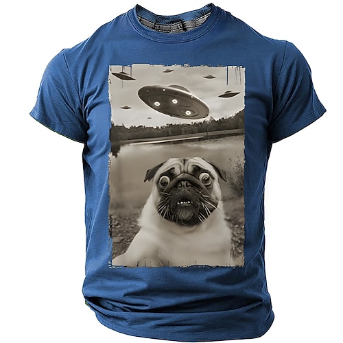 Lustiges Mops-UFO-Raumschiff-Vintage-T-Shirt für Herren, olivgrün, Kurzarm, humorvolles Sci-Fi-Oberteil, Größen S, M, L, XL, XXL, XXXL