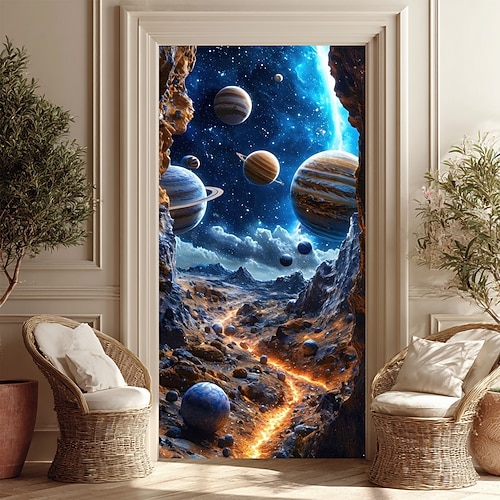 Sci-Fi-Türbanner mit kosmischem Planeten-Stadtbild, leuchtend blau umrandetem Planeten, Galaxienportal, futuristischer Landschaft, Türverkleidung für Schlafzimmer, Spielzimmer, Eingangsbereich,