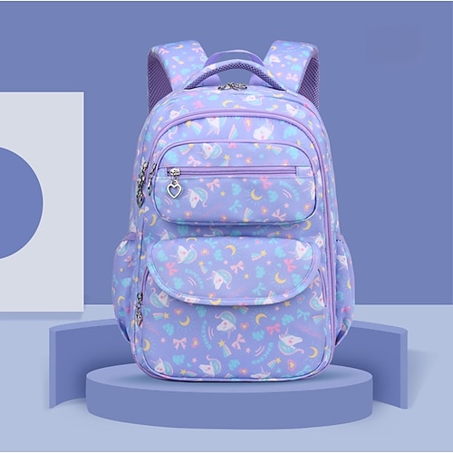 Zaino scolastico stampato per bambine con ciondolo a forma di cuore con cerniera, zaino multitasche leggero e impermeabile per studenti delle scuole elementari e medie, disponibile in rosa, viola, blu e beige