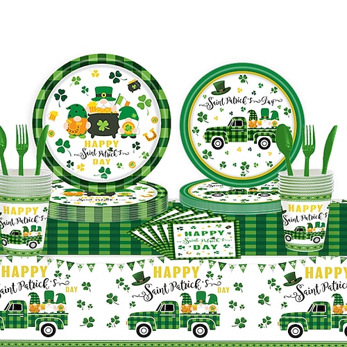 161 pezzi di forniture per la festa di San Patrizio per 20 persone, set di stoviglie usa e getta con piatti, tovaglioli, bicchieri, tovaglie, posate, cannucce, camioncino del folletto con trifoglio,