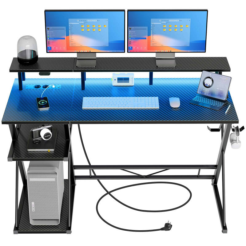 Bureau Gaming SEVEN WARRIOR avec Éclairage LED et Prises, Table Informatique avec Support Écran & Support Unité Centrale, Bureau avec 2 Crochets & Repose-Pieds, Idéal pour Chambre ou Bureau