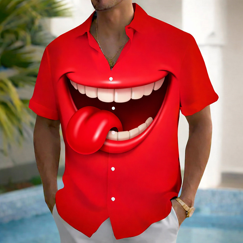 Men's Optical Illusion 3D Cartoon Mouth Shirt Summer Shirt Button Up Shirt Short Sleeve Funny Streetwear Holiday Summer Spring Turndown 3D Print Collared Shirts Front One Pocket Dark Red Red