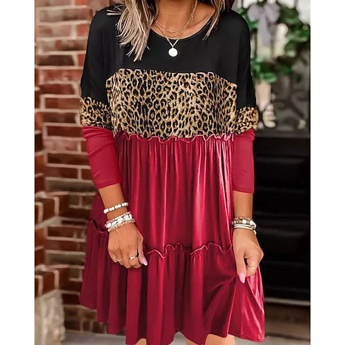 Per donna Mini Abito Vestito Casual Vestito T-Shirt Moderno Quotidiano Vacanza Ferie Vestibilità comoda Leopardo Manica Lunga Girocollo Nero Rosso Arancione Primavera Autunno